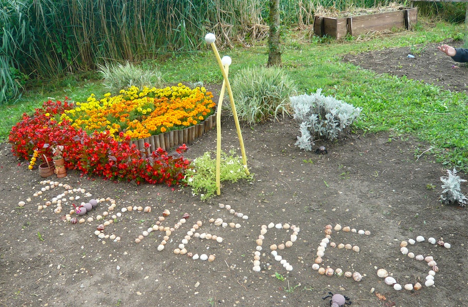 Dessiné au sol avec des œillets dinde et des bégonias, l’escargot tient la vedette. Des chenilles, des coccinelles, des fourmis, des hérissons et des insectes lui tiennent compagnie. Plusieurs ateliers créatifs animés par les élus de la commission fleurissement et des parents ont permis aux enfants de fabriquer les décors à base de pots de fleurs, de verres en plastiques, de boules de polystyrène etc…