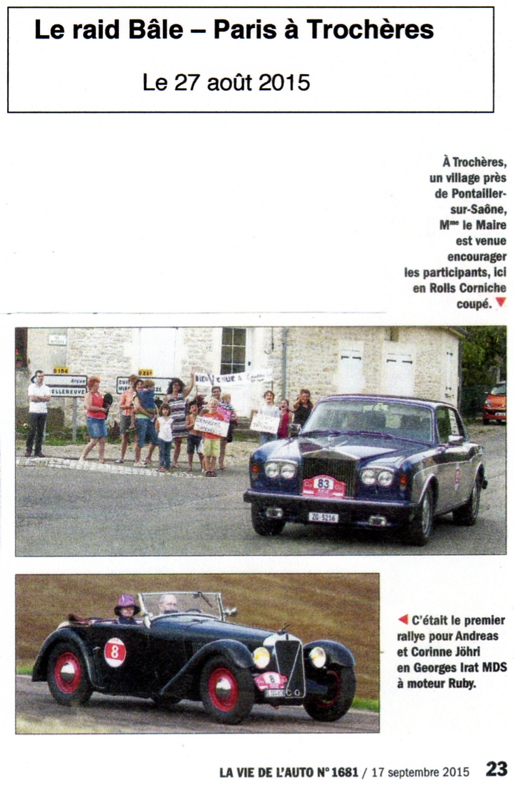 Le magazine La Vie de l’Auto relate le passage, le 27 août dernier, du rallye de voitures de collection Bâle-Paris à Trochères.