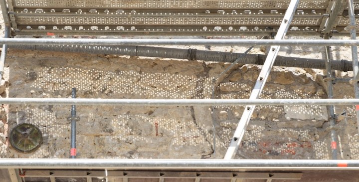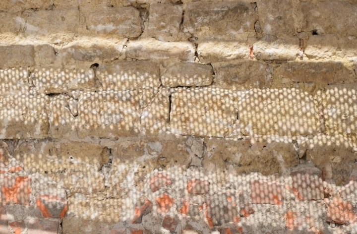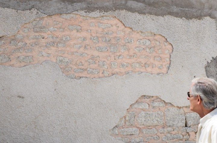 Exemple des désordres découverts sous l’enduit en ciment sur le bout de mur de la sacristie, dans la ruelle.