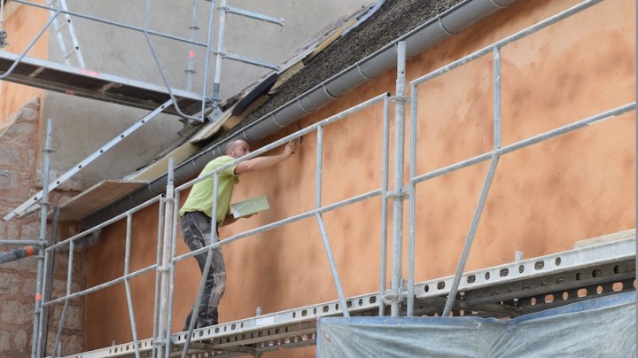 Passage de l’enduit côté logements communaux/ mairie. La couche finale sera talochée pour lui donner un aspect moins neuf.