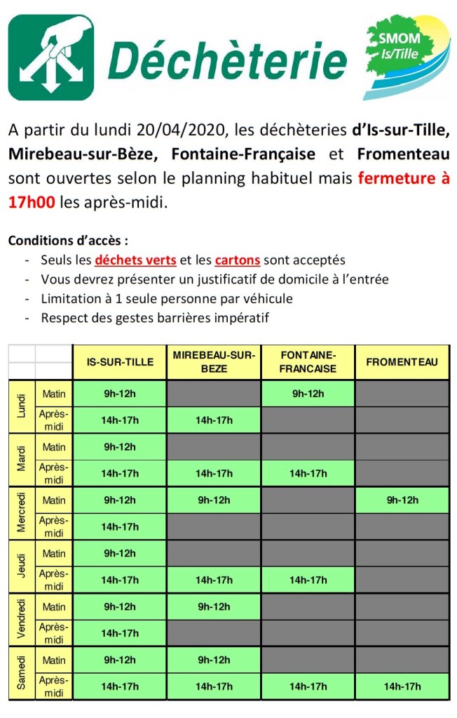 A compter du lundi 20/ avril 2020, les déchèteries d’Is-sur-Tille, Mirebeau-sur-Bèze, Fontaine-Française et Fromenteau rouvrent selon le planning habituel. Néanmoins, la fermeture les après-midi se fera à 17h et non 18h. Pour l’instant, la déchèterie de Belleneuve reste fermée.