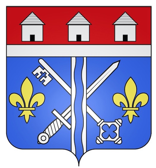 « D’azur, à une épée et une clé d’argent passées en sautoir, accompagnées, en flancs, de deux fleurs de lys d’or, un pal ondé d’azur, bordé d’argent, brochant sur le tout, au chef de gueules, chargé de trois chaumières d’argent, soutenu d’une trangle de même. »