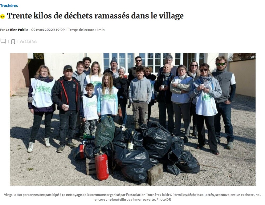 Trochères Loisirs Nettoyage de printemps 2022 Lire l’article en entier : https://www.bienpublic.com/environnement/2022/03/09/trente-kilos-de-dechets-ramasses-dans-le-village Je partage sur : Cliquer pour imprimer(ouvre dans une nouvelle fenêtre) Imprimer Cliquer pour envoyer un lien par e-mail à un ami(ouvre dans une nouvelle fenêtre) E-mail Cliquez pour partager sur Facebook(ouvre dans une nouvelle fenêtre) Facebook J’aime chargement… Similaire
