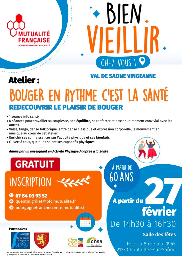 Un atelier collectif de 7 séances autour de la danse, à destination de toute personne âgée de 60 ans et plus se déroulera à compter du 27 février à Pontailler-sur-Saône, à l’initiative de la Mutualité Française en partenariat avec le PETR Val de Saône Vingeanne.