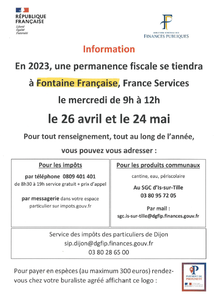 Informations pratiques Permanences fiscales 2023 Je partage sur : Cliquer pour imprimer(ouvre dans une nouvelle fenêtre) Imprimer Cliquer pour envoyer un lien par e-mail à un ami(ouvre dans une nouvelle fenêtre) E-mail Cliquez pour partager sur Facebook(ouvre dans une nouvelle fenêtre) Facebook J’aime chargement… Similaire