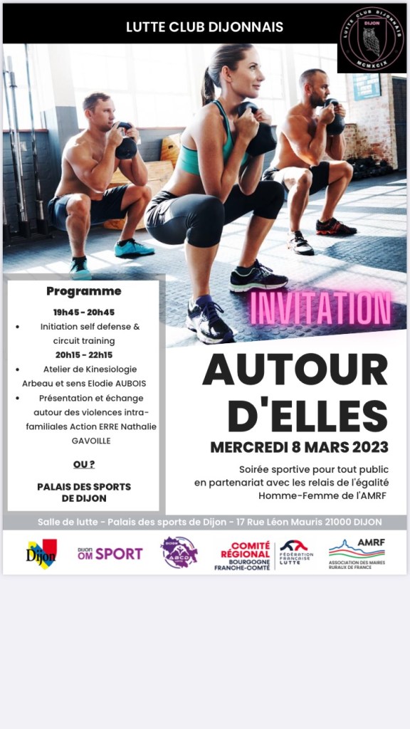 A l’occasion de la journée internationale des femmes, le mercredi 8 mars, chaussez vos baskets au palais des sports de Ville de Dijon . Et si vous essayiez le self défense et le training avec Lutte Club Dijonnais avant de tester la kinésiologie avec Elodie Aubois kinesiologue puis d’échanger avec Nathalie Gavoille, responsable Côte-d’Or du relais Egalité ERRE.