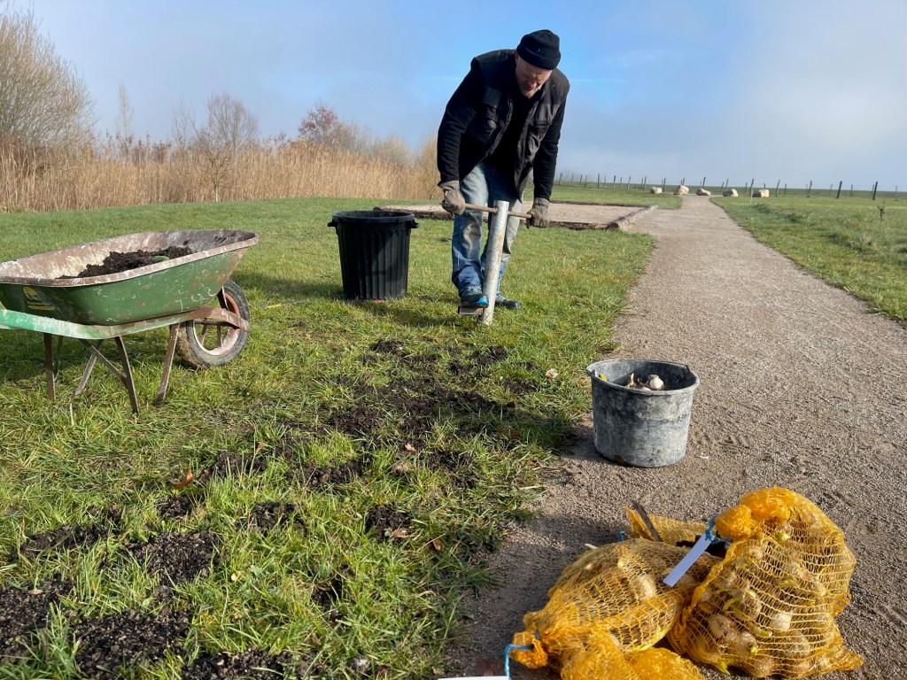 Les matinées entières pendant une semaine, mi-mars, l’employé communal David Dos Res a planté près d’un millier de narcisses le long du sentier du Petit Jardin, de part et d’autre du terrain de pétanque. Les conseillers municipaux Vincent Delorme et Christiane Perruchot sont venus lui prêter main forte certains jours.