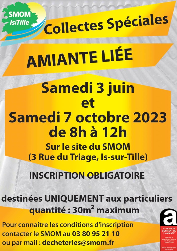 Les prochaines collectes d’amiante offertes par le SMOM d’Is-sur-Tille aux habitants du territoire auront lieu les samedi 3 juin et samedi 7 octobre 2023.