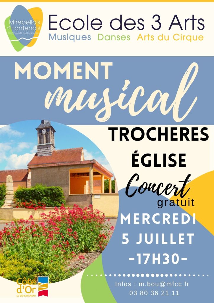L’école des 3 Arts du Mirebellois-Fontenois se déplace à Trochères, pour un moment musical gratuit, donné par les élèves, le mercredi 5 juillet. Réservez votre soirée : c’est à 17h30, à l’église.