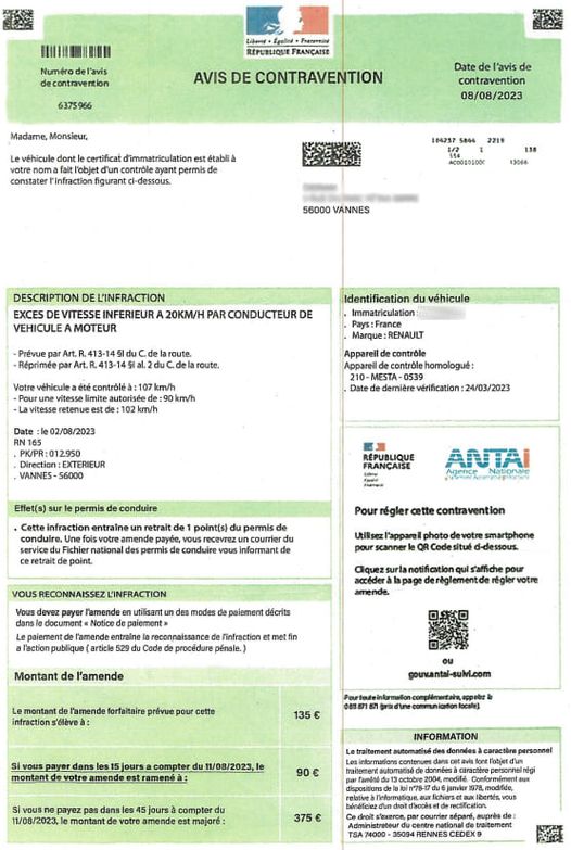 Le numéro d’immatriculation mentionné sur l’avis correspond au véhicule de la personne visée, dont l’adresse est mentionnée en en-tête. La marque de la voiture est également mentionné, mais pas le modèle, contrairement à l’officiel.