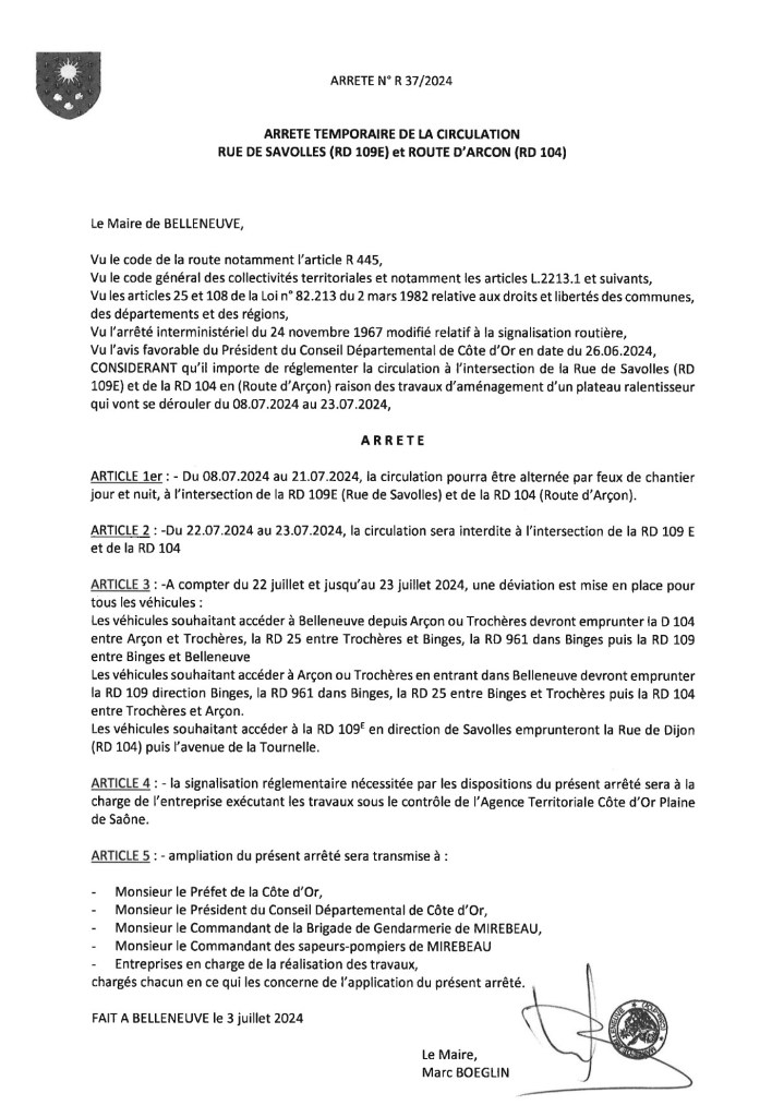 La commune de Belleneuve aménage un plateau ralentisseur à l’intersection des RD 104 (route d’Arçon) et 109E (rue de Savolles), à partir du 8 juillet prochain et jusqu’au 23. En conséquence, une circulation alternée avec feux de jour et de nuit ainsi qu’une déviation seront mise en place pour accéder à Arçon et Trochères où il sera nécessaire de passer par Binges.