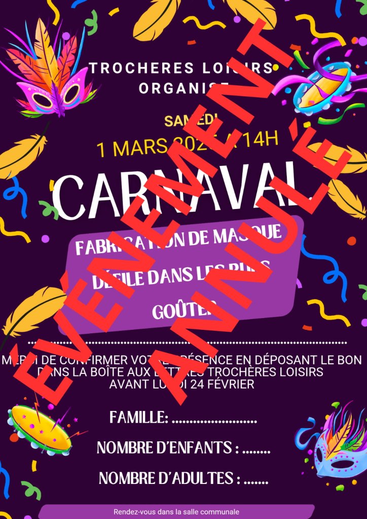 Faute d’un nombre suffisant d’inscriptions, l’atelier de fabrication de masques de Carnaval prévu samedi 1er mars est annulé.