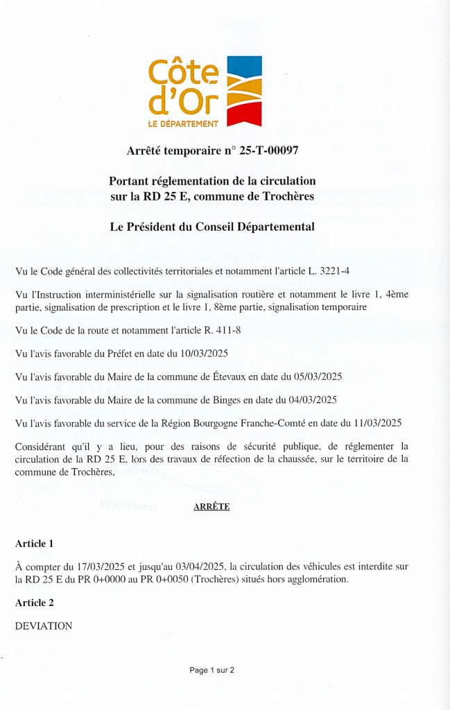 C’est seulement à partir du mardi 25 mars et jusqu’au vendredi 28 inclus que la circulation sera interrompue au niveau de l’intersection des routes de Mitreuil et d’Etevaux, pour cause de travaux sur la route départementale 25 E.