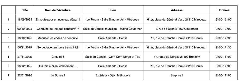 La Communauté de Communes, via Créativ’21 et Malakoff Humanis, propose aux personnes retraitées autonomes, un programme gratuit, se déroulant sur 7 séances entre le 18 septembre 2025 et le 22 janvier 2026 et dont le but est de promouvoir une mobilité sécurisée et respectueuse de l’environnement.