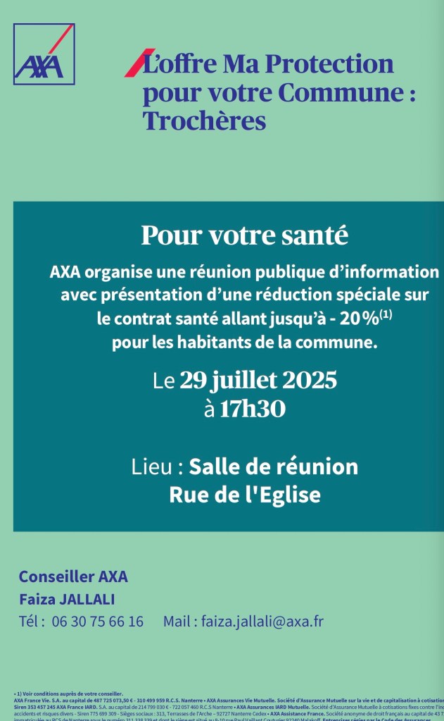 La commune met la salle communale à disposition d’AXA Santé pour une réunion publique sur ses offres Santé, obsèques et dépendance, le 29 juillet à 17h30.