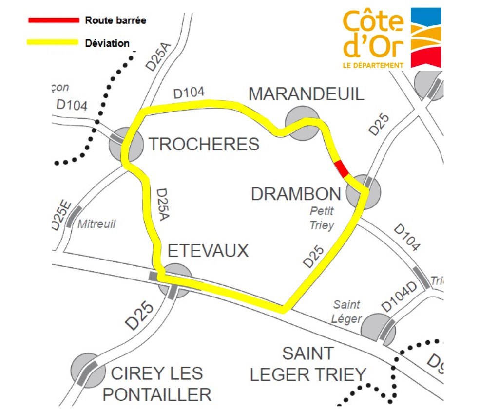 Une déviation est mise en place selon l’itinéraire : RD 104, RD 25, RD 961, RD 25 A, et RD 104, via Petit Triey, Etevaux, Trochères, Marandeuil, selon le plan ci-dessous.