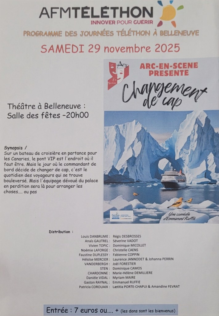 Trochères Loisirs qui organise l’événement, s’associe depuis plusieurs années avec l’équipe de Belleneuve. Le premier rendez-vous de cette action de solidarité a lieu samedi 29 novembre à 20h avec une pièce de théâtre à la salle des fêtes.