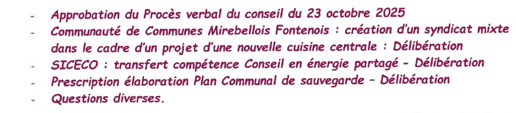 Accueil, Le conseil municipal Réunion du conseil municipal mardi 20 janvier 2026 Le prochain conseil municipal se déroulera mardi 20 janvier 2026 à 20h en mairie. L’ordre du jour est le suivant : Je partage sur : Imprimer(ouvre dans une nouvelle fenêtre) Imprimer Email a link to a friend(ouvre dans une nouvelle fenêtre) E-mail Partager sur Facebook(ouvre dans une nouvelle fenêtre) Facebook J’aime chargement… Similaire