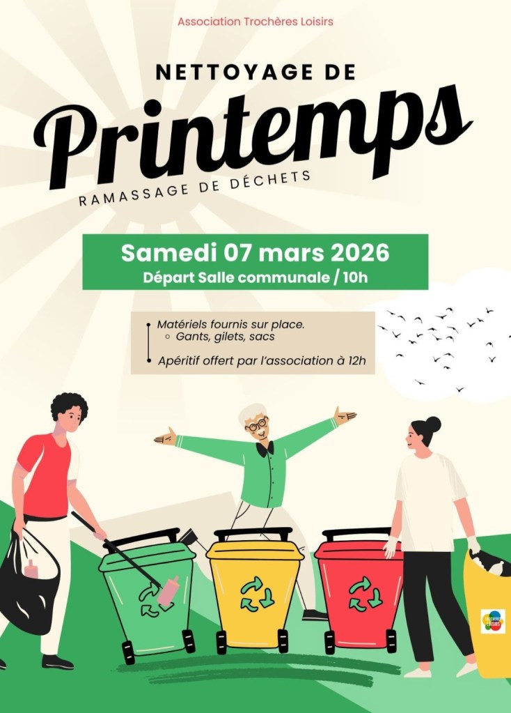 Le printemps approche… C’est le moment comme tous les ans, pour Trochères Loisirs d’organiser le nettoyage des rues et fossés du village.