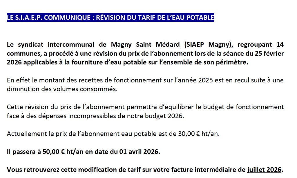 Ci-dessous, le communiqué du SIAEP (Syndicat Intercommunal de Magny-Saint-Médard) reçu ce jour en mairie.